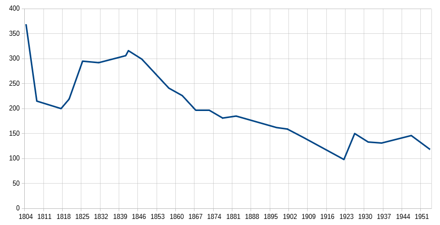 Si on se reporte au graphique de population, on remarque que la courbe est assez irrégulière, mais qu’elle indique une baisse importante de la population entre 1804 et 1954.