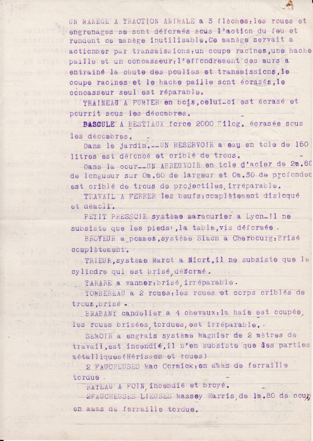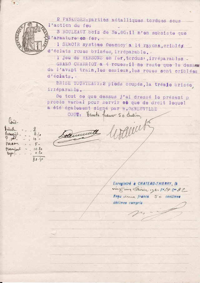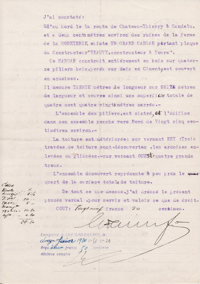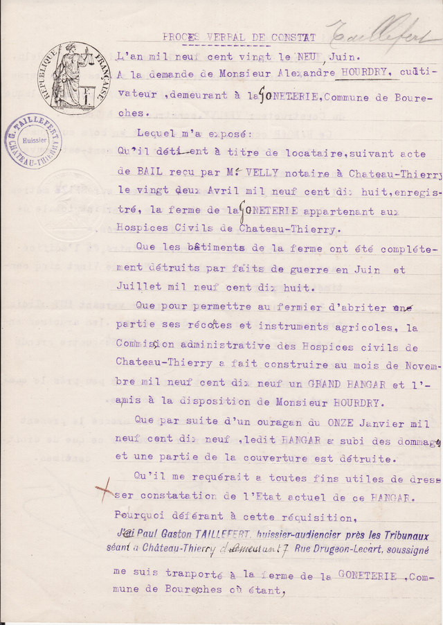 La guerre a laissé des traces… Au sortir de la Première Guerre Mondiale, les terres aux alentours de Château-Thierry sont ravagés. La ferme de la Gonetterie n’échappe pas à la règle : elle a été anéantie par les obus et incendiée. Le matériel agricole ne vaut guère mieux. Et quand on est locataire, mieux vaut prendre ses précautions. Alors Alexandre HOURDRY fait dresser un procès-verbal de constat de l’état de la ferme et des matériaux, ceci le 21 février 1920 par Paul TAILLEFER « huissier-audiencier près les tribunaux ». Résultat :