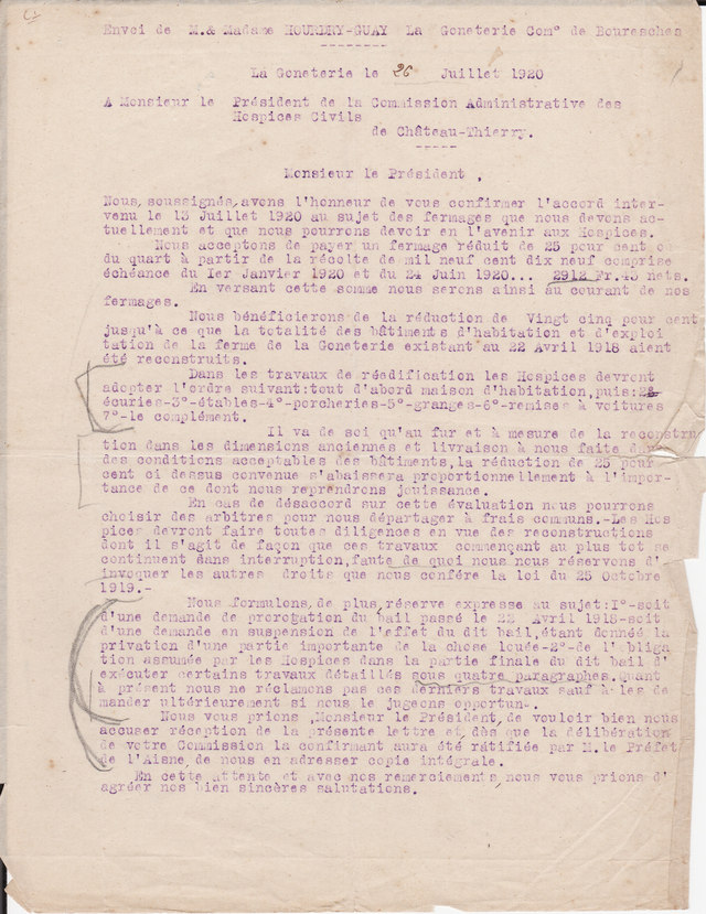 En effet, les Hospices ne considèrent pas la lettre d’Alexandre HOURDRY du 27 juillet 1920 comme une acceptation pure et simple de l’accord (réduction de 25% des fermages jusqu’à l’édification des bâtiments.