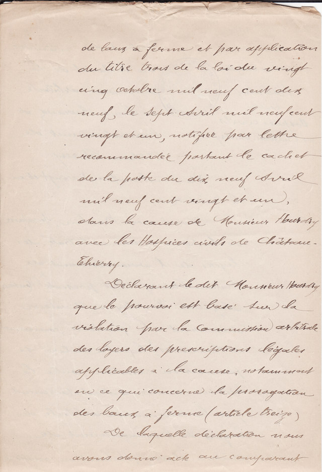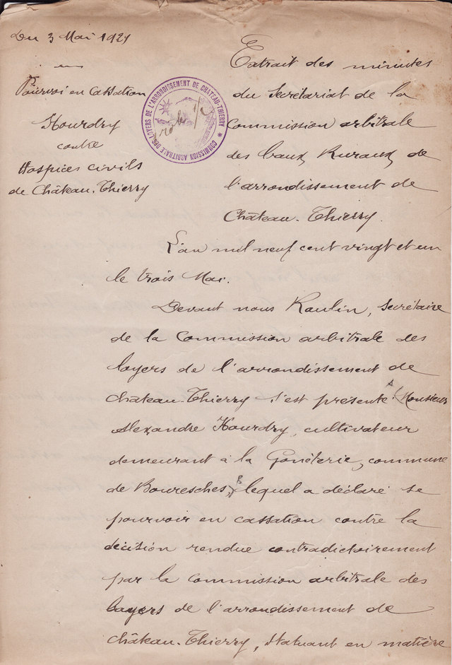 Quelques mois plus tard, le 7 juin précisément, les Hospices Civils de Château-Thierry font parvenir un courrier à Alexandre Hourdry lui indiquant