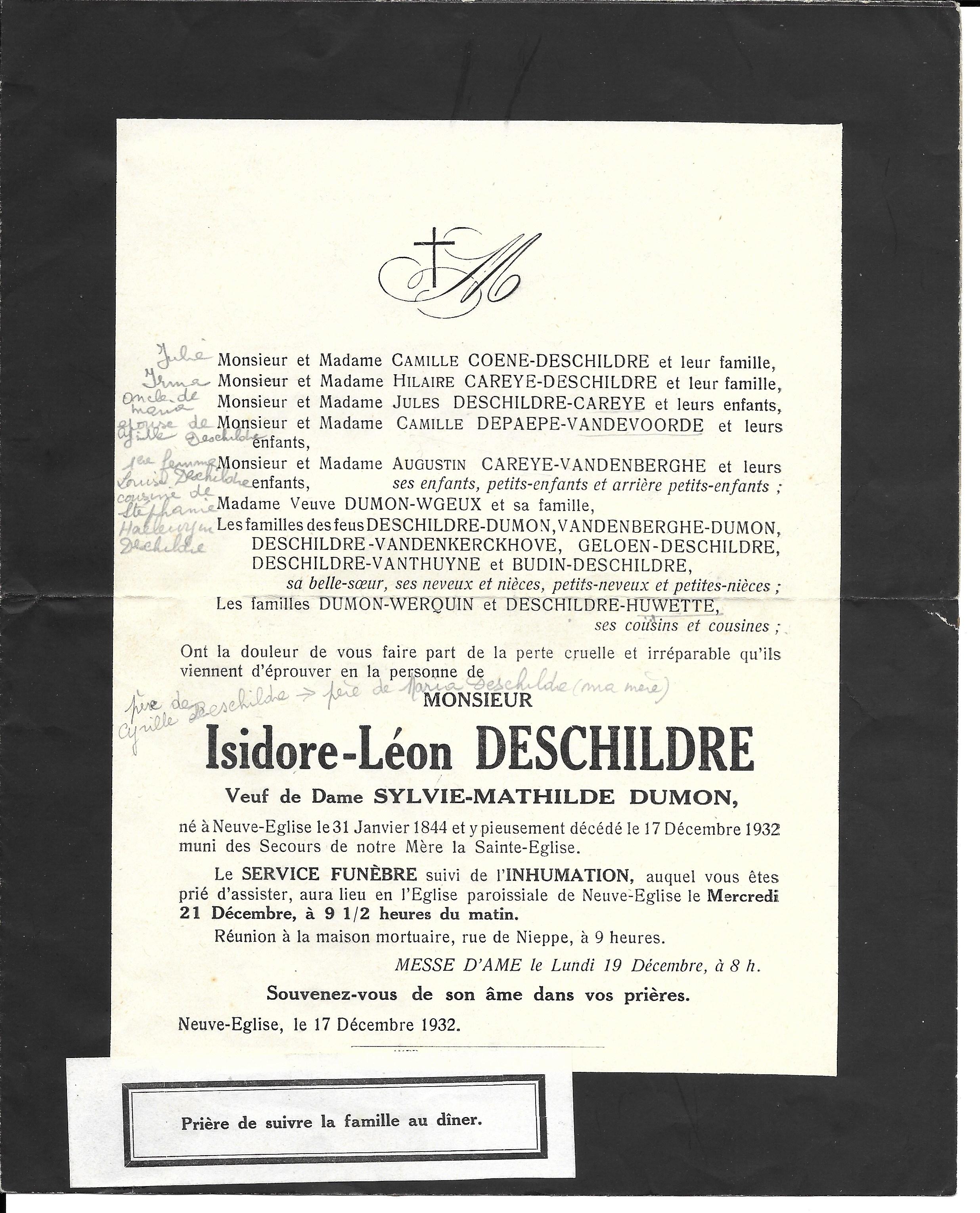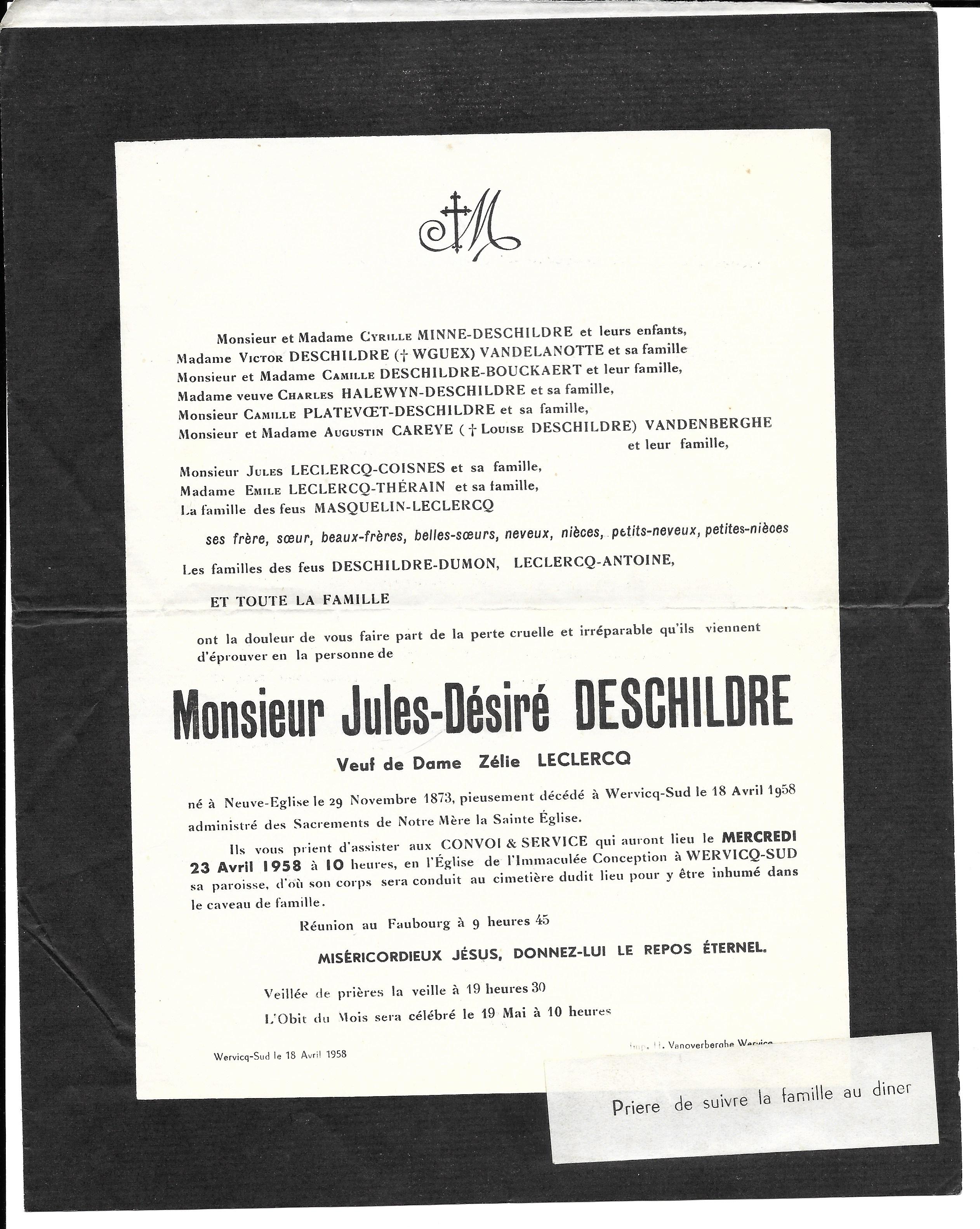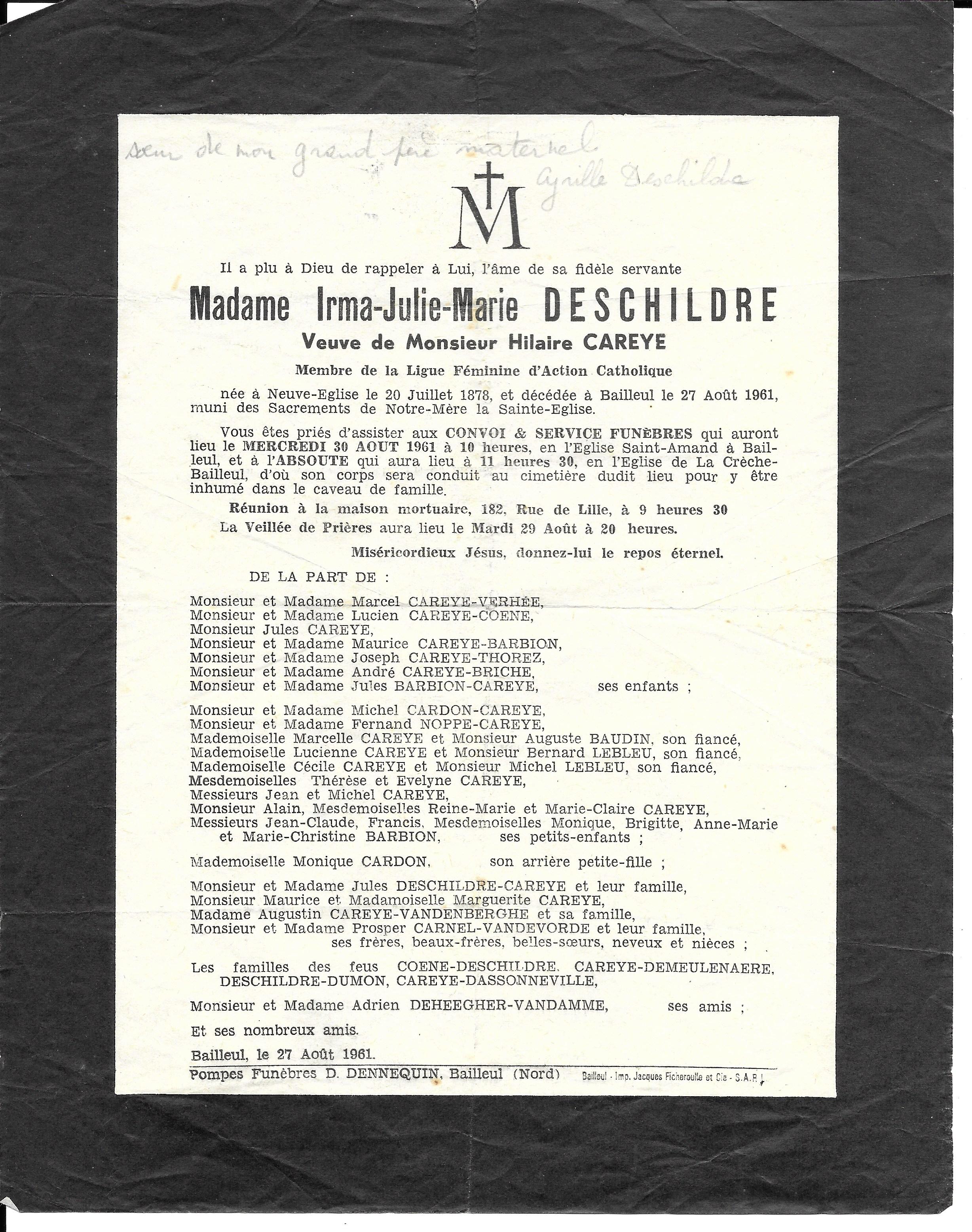 Irma DESCHILDRE 27/08/1961 Isidore DESCHILDRE 17/12/1932 Jules DESCHILDRE 18/04/1958 Maria DESCHILDRE 17/05/1943 Marie DESCHILDRE 17/01/1948 Stephanie DESCHILDRE 21/04/1961 Victor DESCHILDRE 19/02/1951