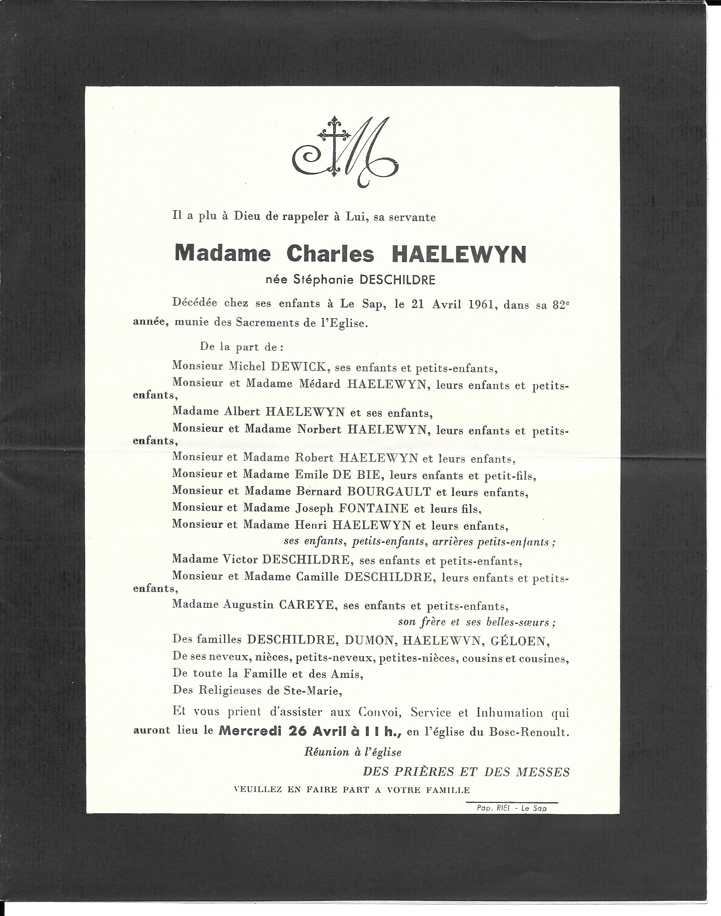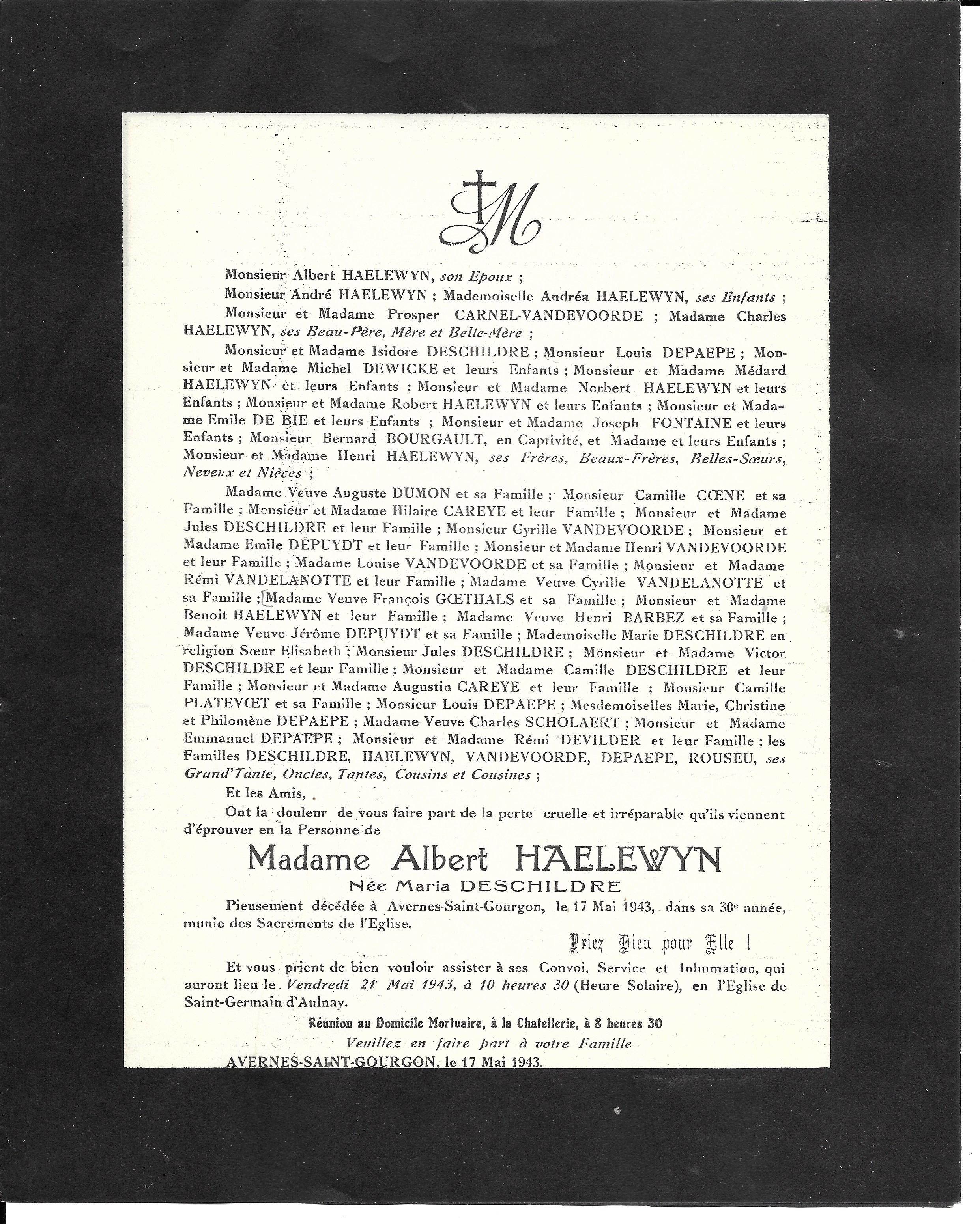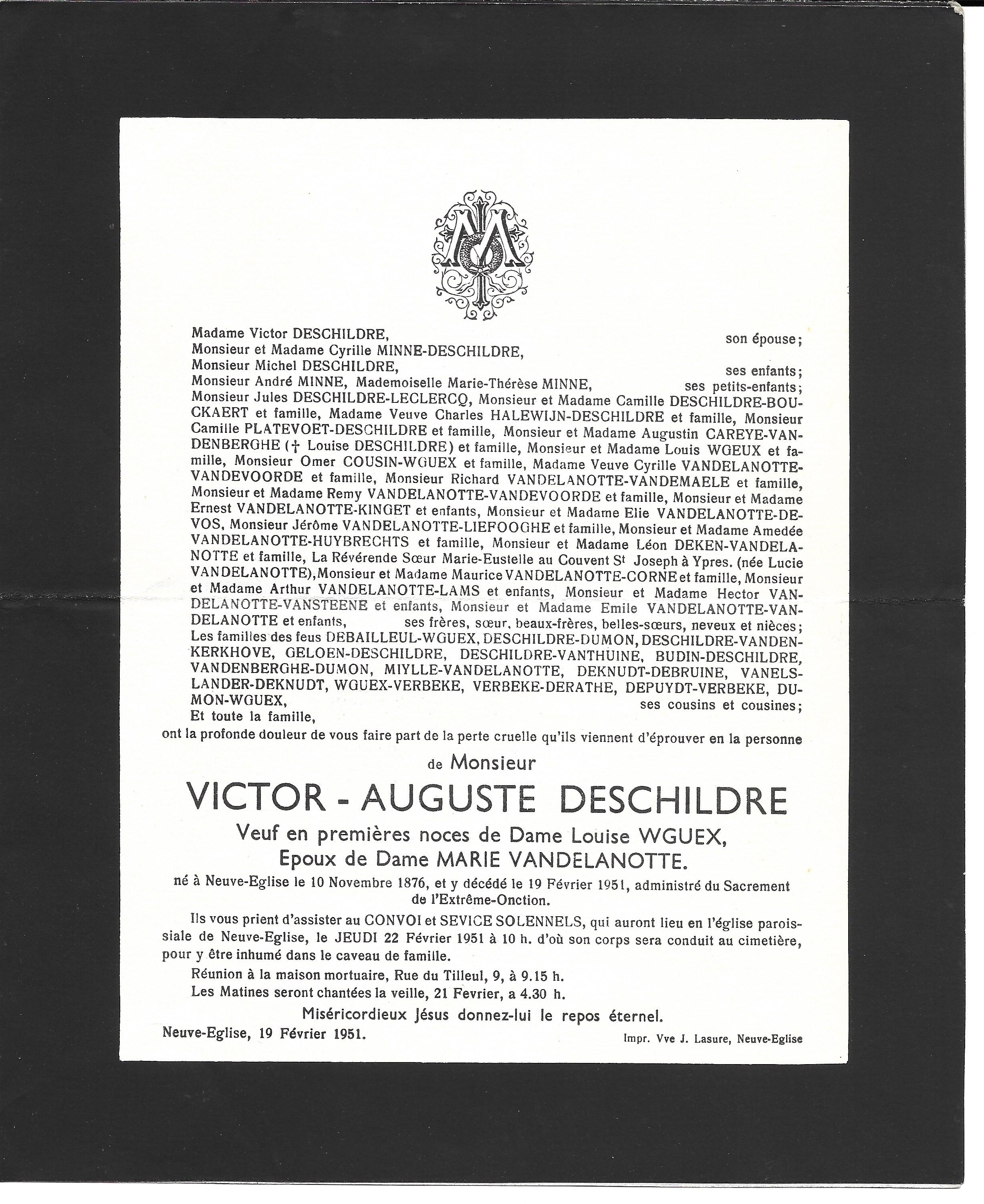 Irma DESCHILDRE 27/08/1961 Isidore DESCHILDRE 17/12/1932 Jules DESCHILDRE 18/04/1958 Maria DESCHILDRE 17/05/1943 Marie DESCHILDRE 17/01/1948 Stephanie DESCHILDRE 21/04/1961 Victor DESCHILDRE 19/02/1951