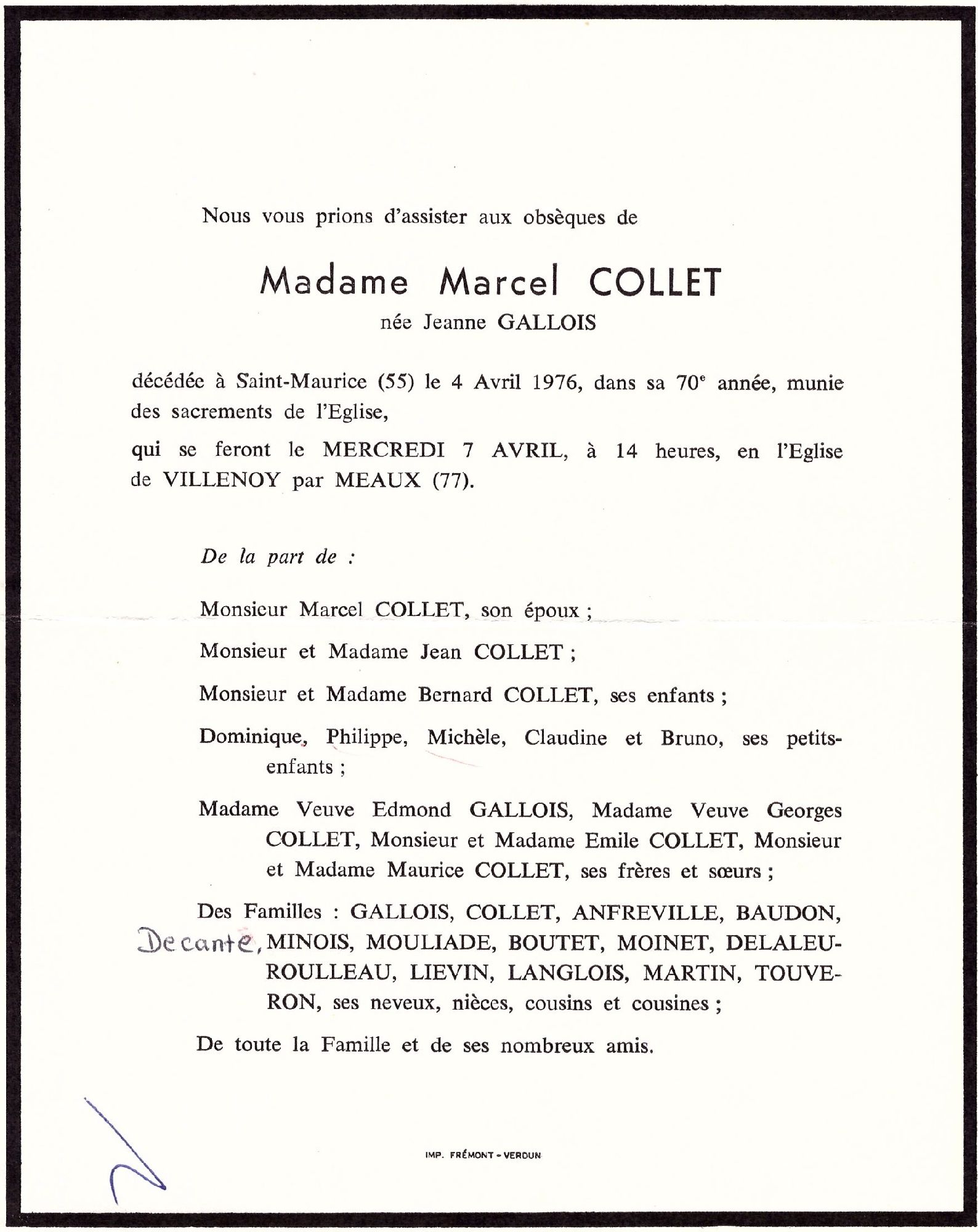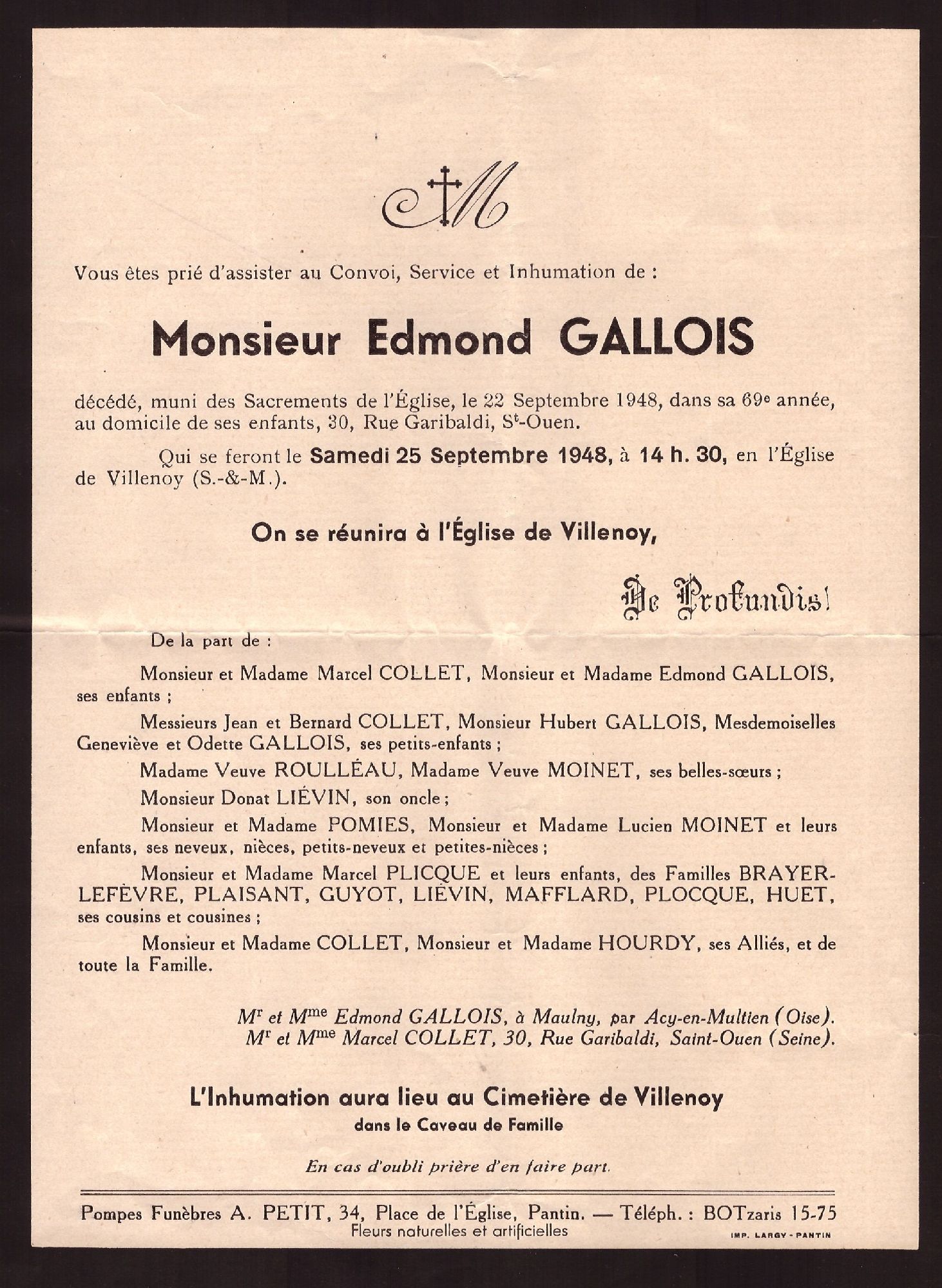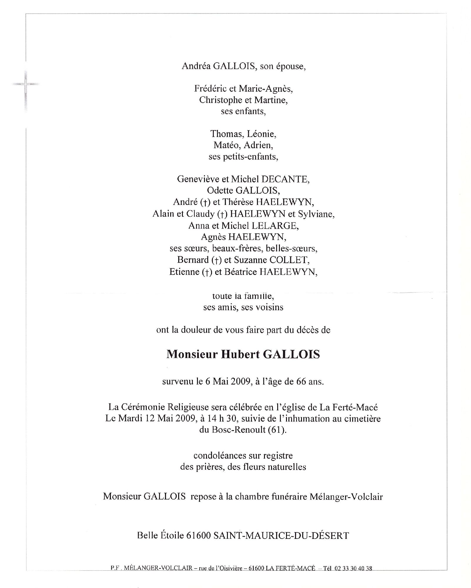 Edmond GALLOIS 22/09/1948 Hubert GALLOIS 06/05/2009 Jeanne GALLOIS 04/04/1976 Marie GALLOIS 27/01/1970
