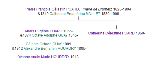 Il faut partir de Yvonne HOURDRY. Ses parents étaient Céleste GAUY et Alexandre HOURDRY. Les parents de Céleste s’appelaient Anaïs POARD et Octave GUAY (le centenaire).