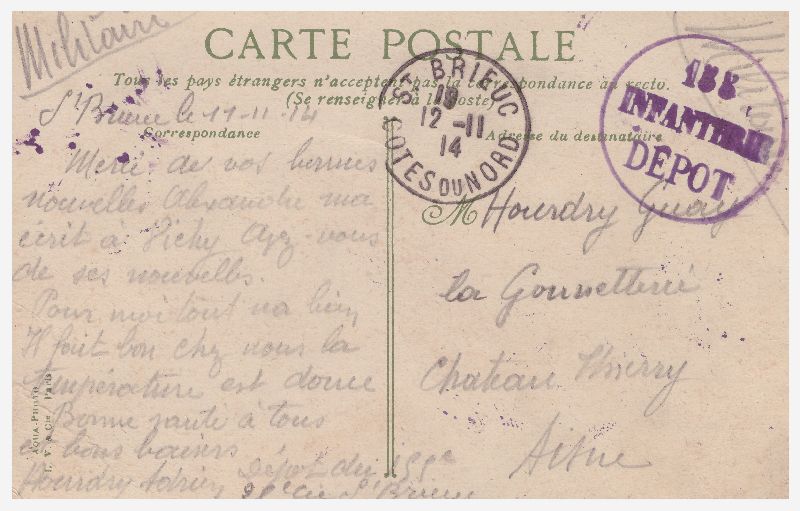 Adrien étant affecté au 155ème RI, il est tout naturellement dirigé vers Saint Brieuc d’où il envoie d’ailleurs une carte postale, tout juste 4 ans avant l’armistice, le 11/11/1914. Il écrit au domicile de son frère Alexandre, sachant que celui-ci est au front.
