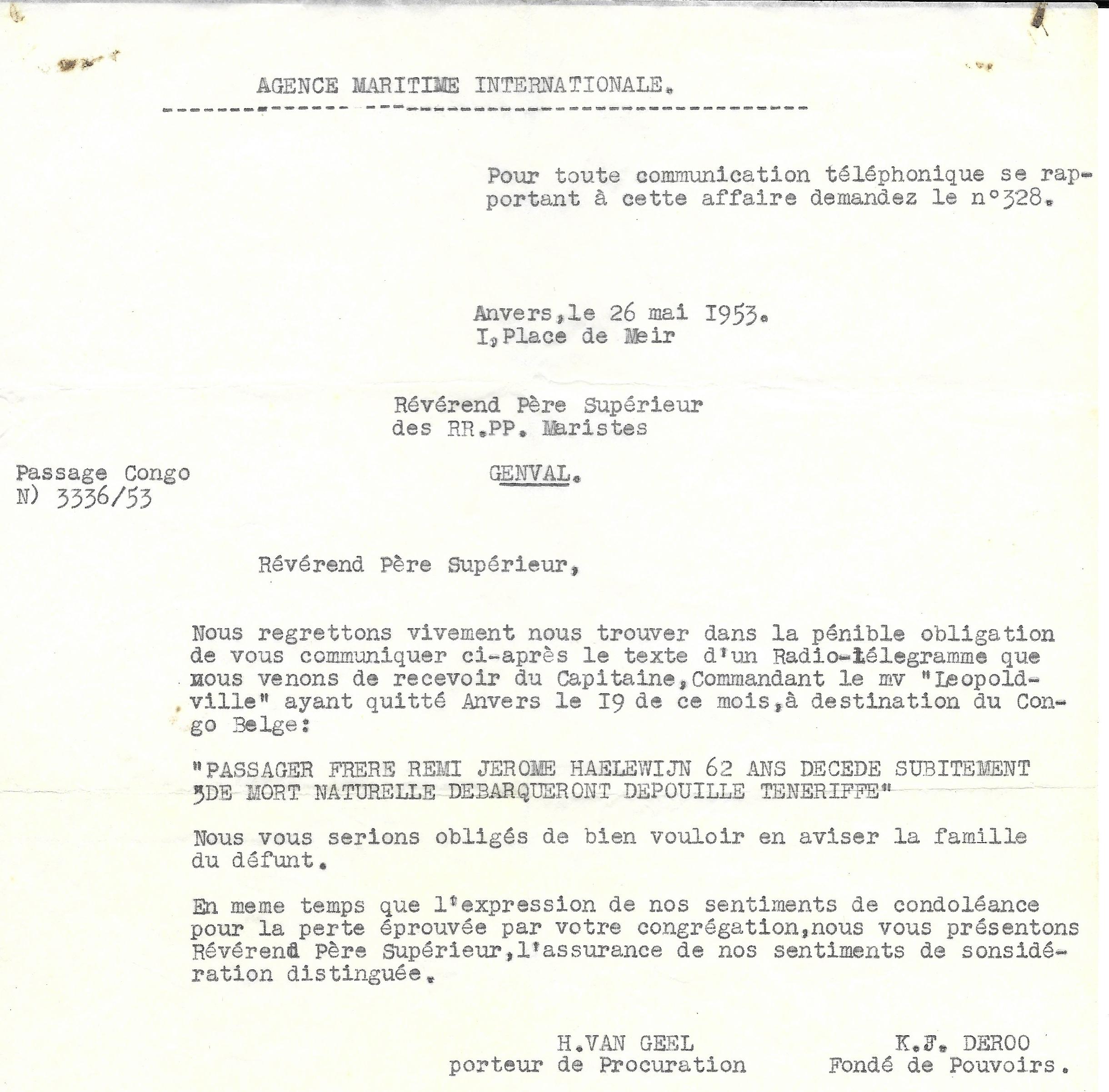 Finalement, Frère Irénion repart vers le Congo en 1953 en embarquant sur le Léopoldville, sur lequel il décède durant le trajet le 24 mai 1953. Son corps est débarqué et inhumé à Tenerife.