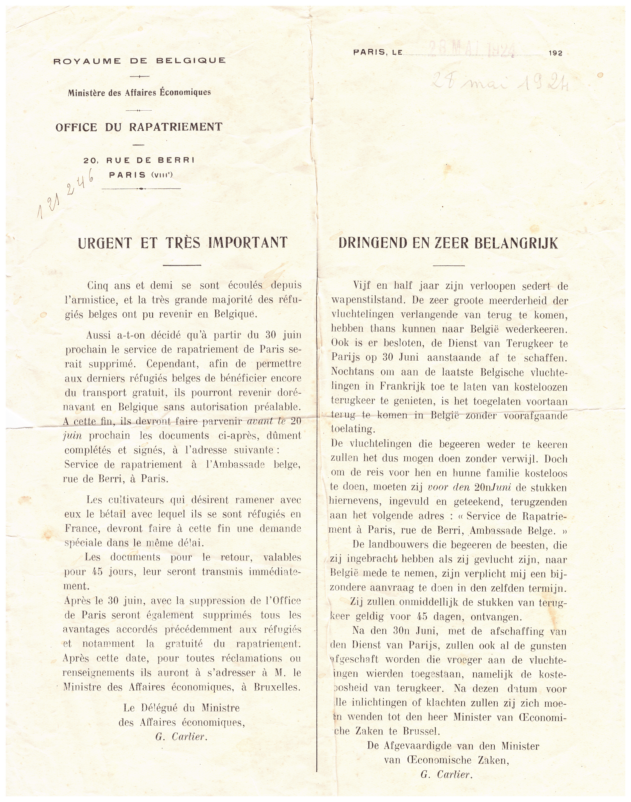 Je n’ai pas de détails jusqu’en 1933, si ce n’est cette offre du gouvernement Belge pour le rapatriement des réfugiés.